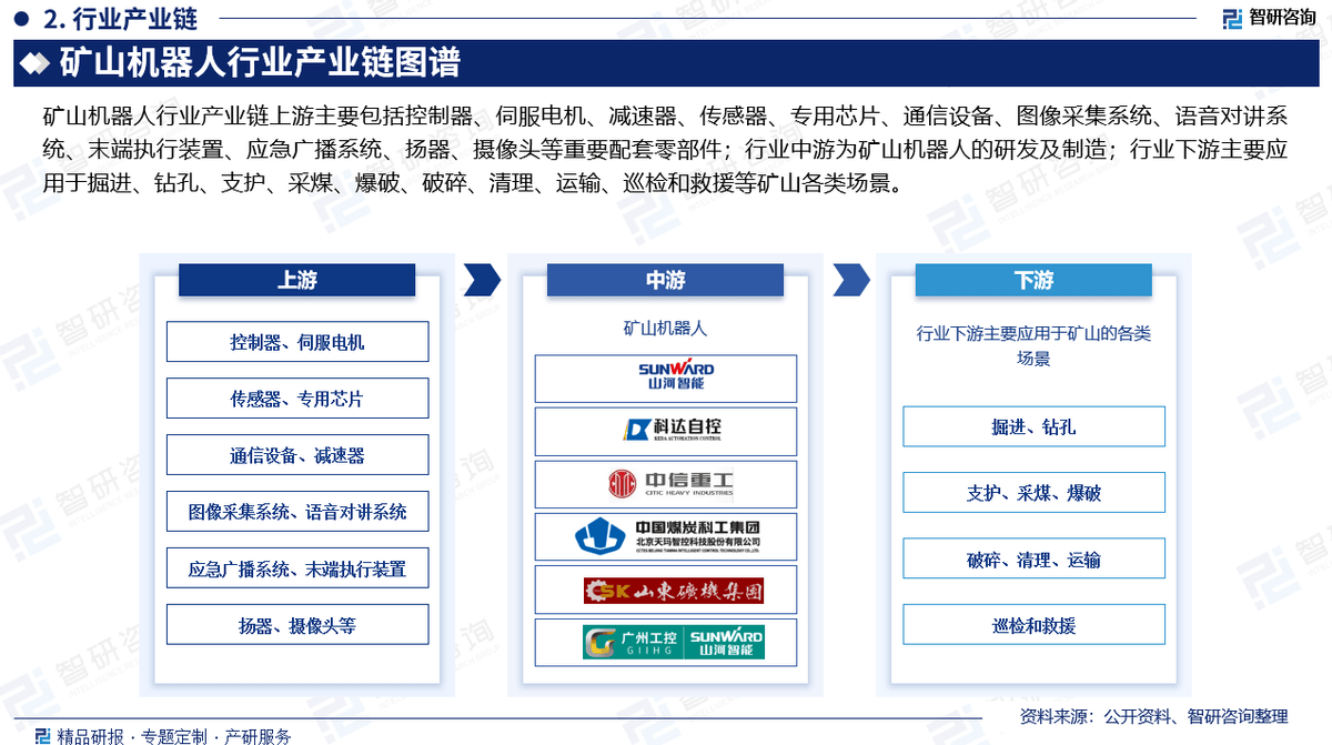 矿山机械人行业财产链上逛次要包罗节制器、伺服电机、减速器、传感器、公用芯片、通信设备、图像采集系统、语音对讲系统、结尾施行安拆、应急系统、扬器、摄像甲等主要配套零部件;行业中逛为矿山机械人的研发及制制;行业下逛次要使用于掘进、钻孔、支护、采煤、爆破、破裂、清理、运输、巡检和救援等矿山各类场景。