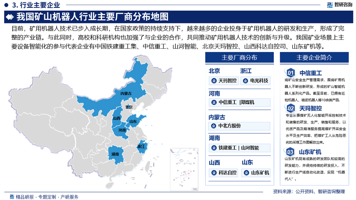 矿山机械人财产正在国度政策的持续鞭策下,正送来史无前例的成长机缘。人工智能、机械视觉、无线通信等手艺,为矿用机械人快速成长供给了的手艺支持。目前,矿用机械人手艺已步入成持久,正在国度政策的持续支撑下,越来越多的企业投身于矿用机械人的研发和出产,构成了完整的财产链。取此同时,高校和科研机构也加强了取企业的合做,市场需求增加和合作加剧,促使企业不竭加大手艺立异和产物研发投入,以提拔本身市场所作力和市场份额。目前,我国矿业场景前次要设备智能化的参取代表企业有中国铁建沉工集团股份无限公司、中信沉工开诚智能配备无限公司、江山智能配备股份无限公司、天玛智控科技股份无限公司、山西科达自控股份无限公司、山东矿机集团股份无限公司等。