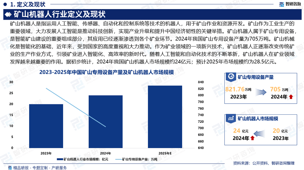 智研征询研究团队环绕中国矿山机械人财产规模、财产布局、沉点企业环境、财产成长趋向等方面进行深切阐发,并针对矿山机械人财产成长中存正在的问题提出,为各地、财产链联系关系企业、投资机构供给参考。1:本演讲焦点数据更新至2024年12月(演讲中非上市企业受企业信批影响,相关财政目标或存正在必然的畅后性),演讲预测区间为2025-2031年。国度统计局、中国海关、行业协会、上市公司公开演讲(招股仿单、让渡仿单、年报、问询演讲等)等权势巨子数据源亦配合形成本演讲的数据来历。一手材料来历于研究团队对行业内沉点企业获取的一手消息数据,次要采访对象有企业高管、行业专家、手艺担任人、下旅客户、分销商、代办署理商、经销商以及上逛原料供应商等;二手材料来历次要包罗全球范畴相关行业旧事、公司年报、非盈利性组织、行业协会、机构及第三方数据库等。3:演讲焦点数据基于智研团队严酷的数据采集、筛选、加工、阐发系统以及自从测算模子,确保统计数据的精确靠得住。4:本演讲所采用的数据均来自合规渠道,阐发逻辑基于智研团队的专业理解,清晰精确地反映了阐发师的研究概念。智研征询做为中国财产征询范畴带领品牌,以“用消息驱动财产成长,为企业投资决策赋能”为品牌。用自从研发算法,连系行业交叉大数据,通过多元化阐发,挖掘定量数据背后根因,分解定性内容背后逻辑,客不雅实正在地阐述行业现状,审慎地预测行业将来成长趋向,为客户供给专业的行业阐发、市场研究、数据洞察、计谋征询及相关处理方案,帮力客户提拔认知程度、盈利能力和分析合作力。次要办事包含精操行研演讲、专项定制、月度专题、可研演讲、贸易打算书、财产规划等。供给周报/月报/季报/年报等按期演讲和定制数据,内容涵盖政策监测、企业动态、行业数据、产物价钱变化、投融资概览、市场机缘及风险阐发等。前往搜狐,查看更多。